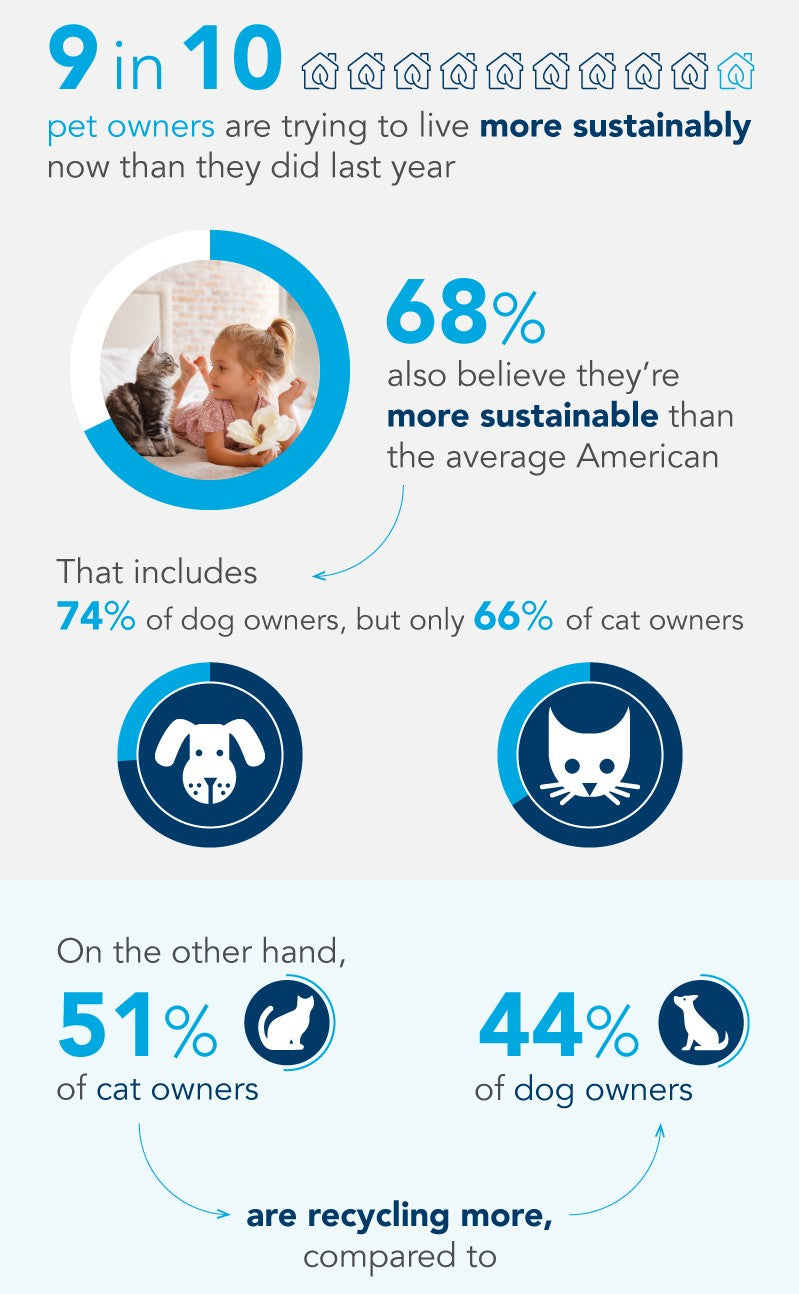 2,000 cat and dog owners in the United States were polled for this survey, and of those pet parents, 69% believe they enjoy a more sustainable lifestyle compared to the average Americans.