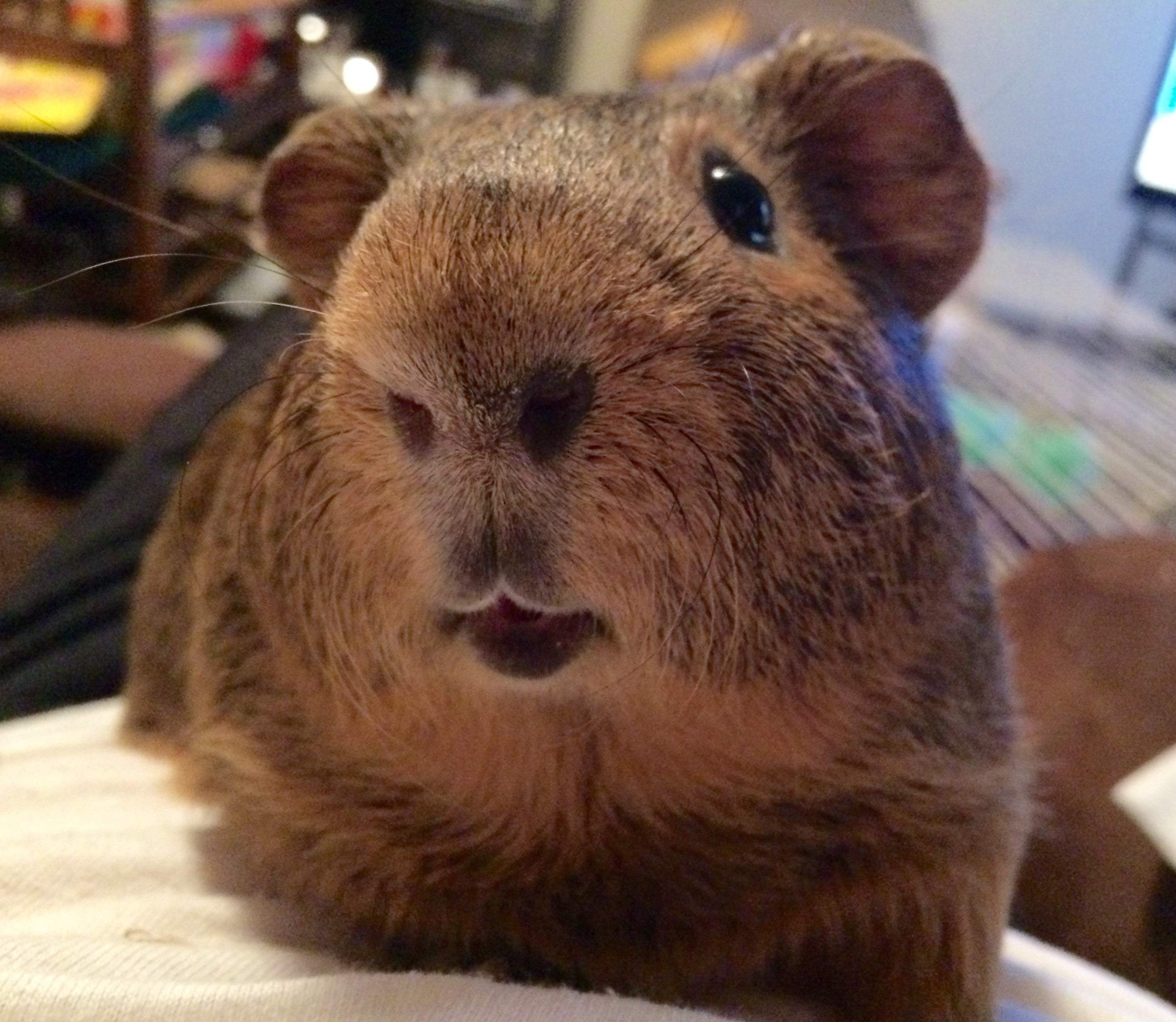 From 2017, my guinea pig Biscotti is under the tv stand, but you clearly hear him chirping.